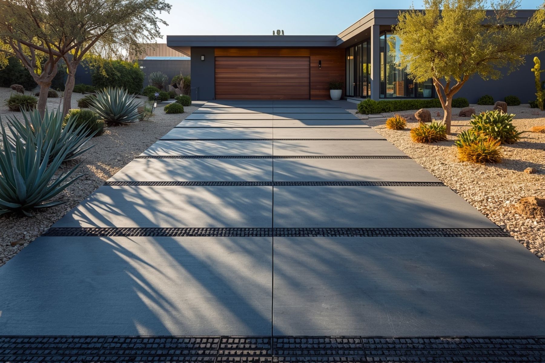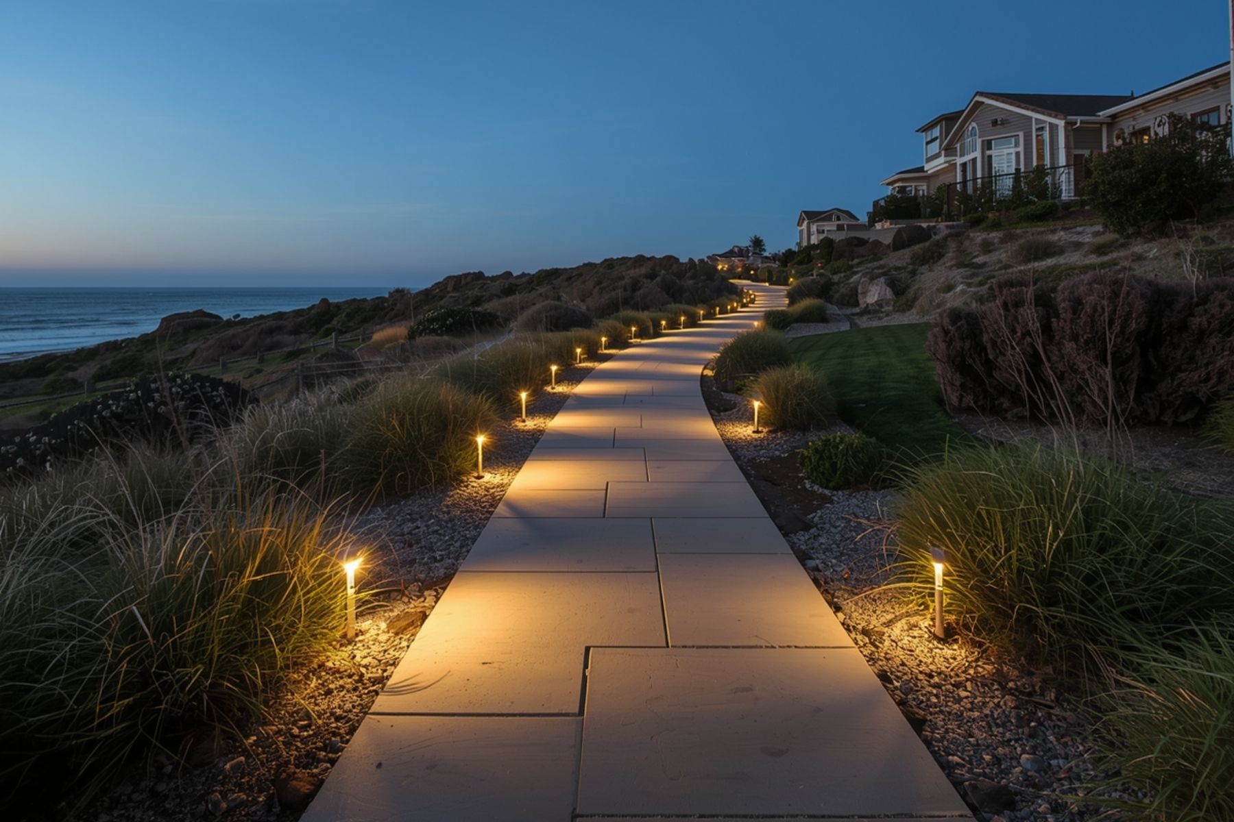 Code-compliant grading for drainage and accessibility. Leading-line design from street to door.
